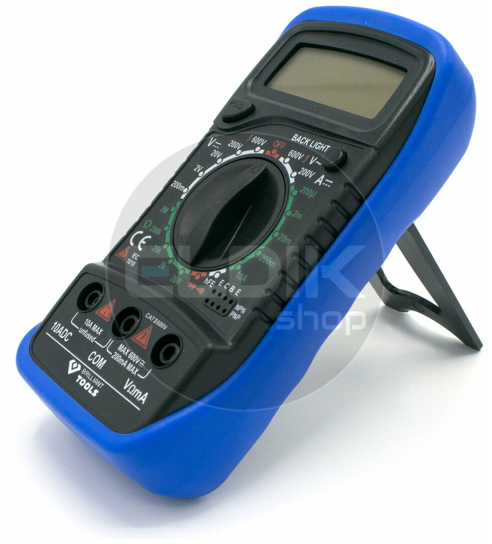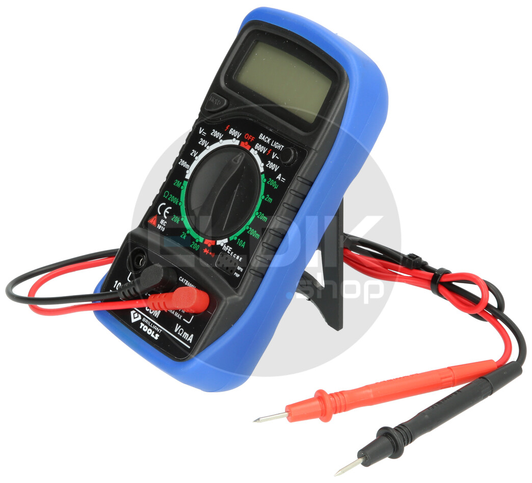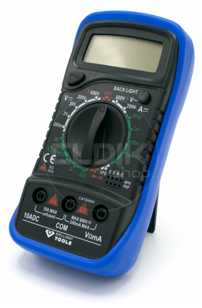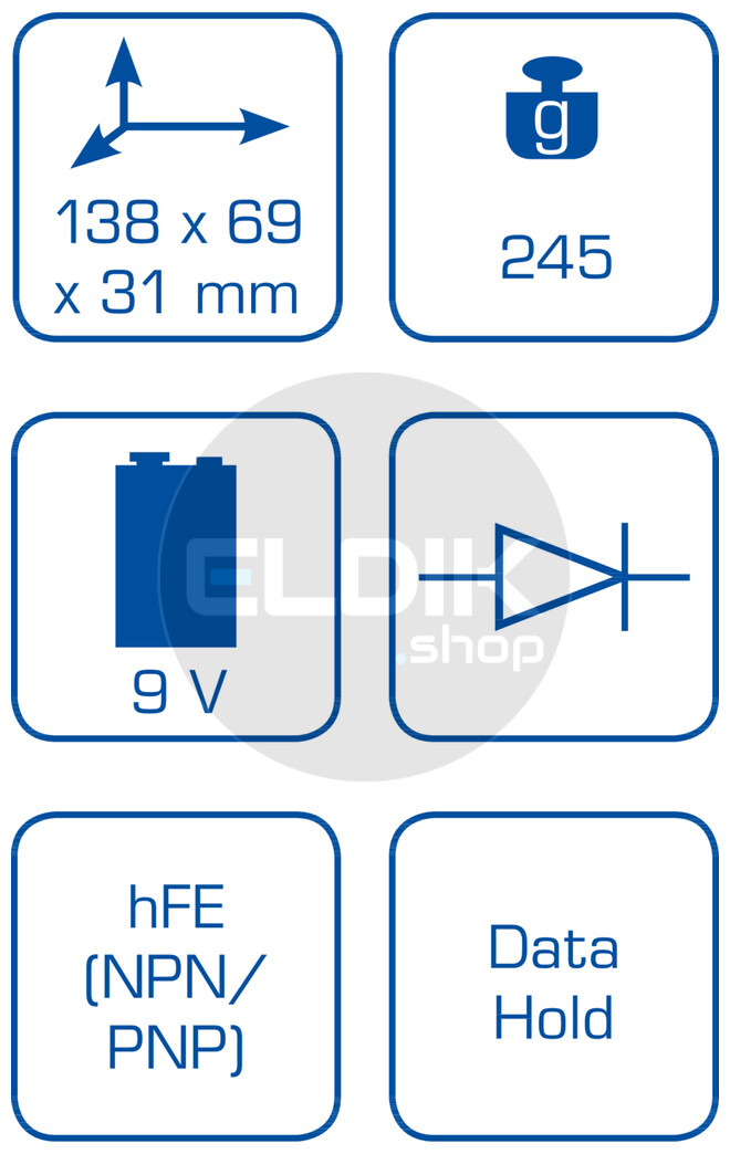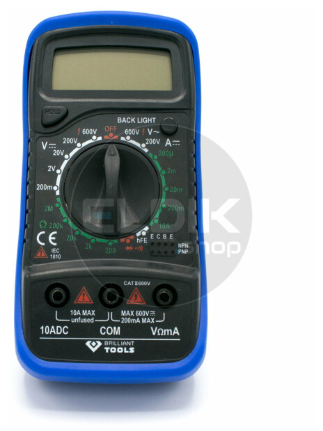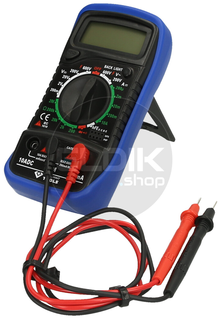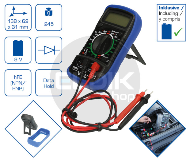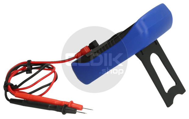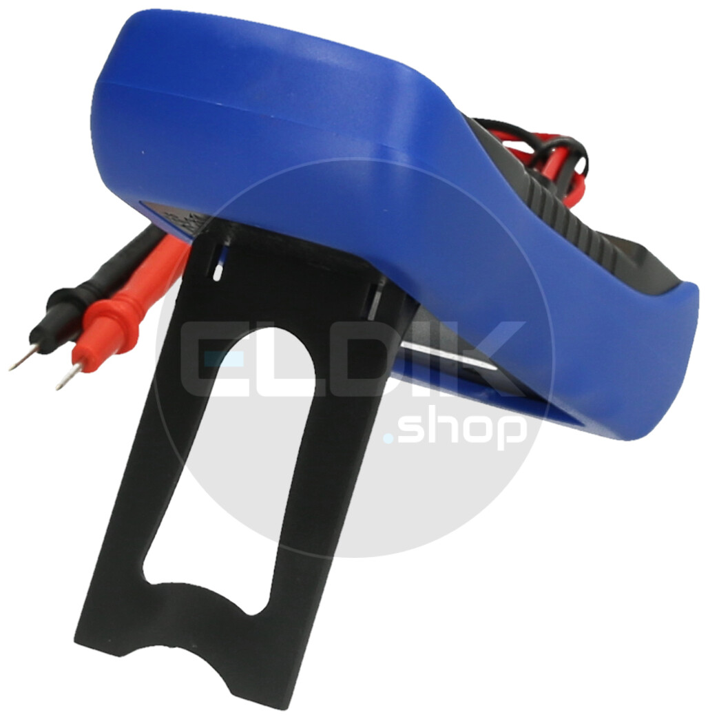 - Overlastbeveiliging bij de meting van AC/DC-spanning, AC/DC-stroom, weerstanden, capaciteit, dioden, logicatests en doorgangstest