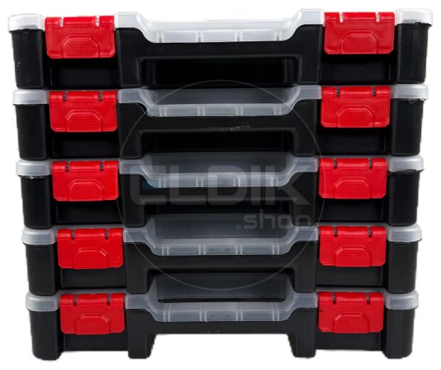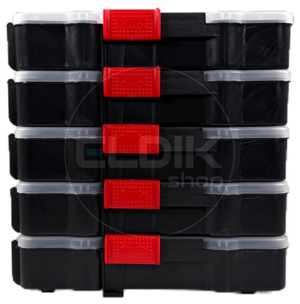 De E-Tools Sorty M assortimentsdoos is een praktische oplossing voor het overzichtelijk opslaan van kleine onderdelen zoals schroeven, bouten, moeren en andere montagematerialen. De doos heeft een formaat van 330 x 270 x 60 mm en is gemaakt van stevig kunststof voor dagelijks gebruik in werkplaats of magazijn. De assortimentsdoos is voorzien van twee schuifgrepen waarmee de doos veilig kan worden afgesloten. Deze schuifgrepen maken het ook mogelijk om meerdere Sorty assortimentsdozen aan elkaar te koppelen, zodat ze samen als één geheel kunnen worden vervoerd of opgeslagen. De transparante deksel zorgt ervoor dat de inhoud altijd direct zichtbaar is.