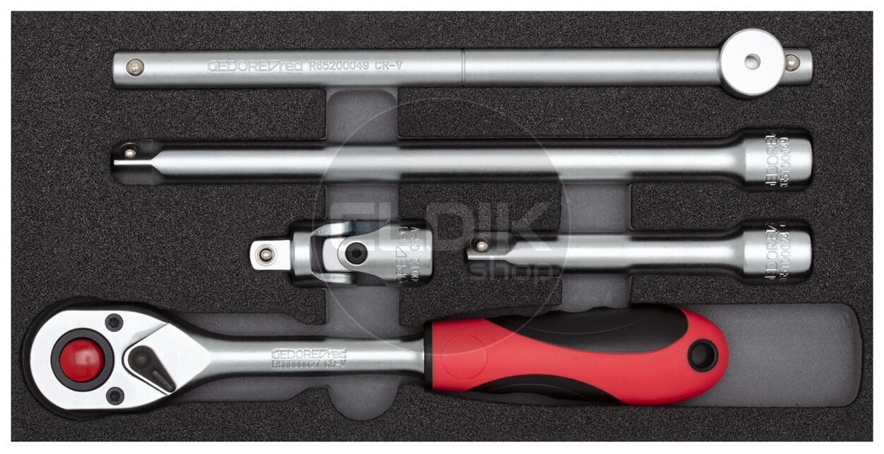 De GEDORE R22150008 is een compacte 5-delige dopsleutelset in schuimstofmodule, ideaal als basis of aanvulling in professionele werkplaatsen en perfect passend in GEDORE werkbanken en gereedschapswagens. De set bevat een fijnvertande 1/2” ratel met 72 tanden, omschakelbaar van rechts- naar linksom en voorzien van een drukknop-ontkoppeling. Dankzij de 2-componenten handgreep en de ovale kop ligt de ratel comfortabel in de hand en werk je nauwkeurig en efficiënt. Naast de ratel bevat de set verschillende verlengingen, een cardangewricht en een dwarshandgreep. Alle onderdelen zijn uitgevoerd in hoogwaardig chroom-vanadiumstaal, mat gesatineerd verchroomd, en conform internationale normen (DIN/ISO).