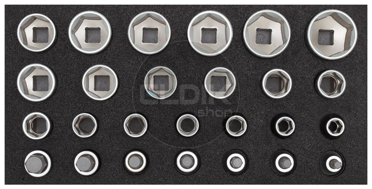 - 1/2" dopsleutels binnenzeskant SW: 10, 11, 12, 13, 14, 15, 16, 17, 18, 19, 21, 22, 23, 24, 26, 27, 28, 30, 32 mm