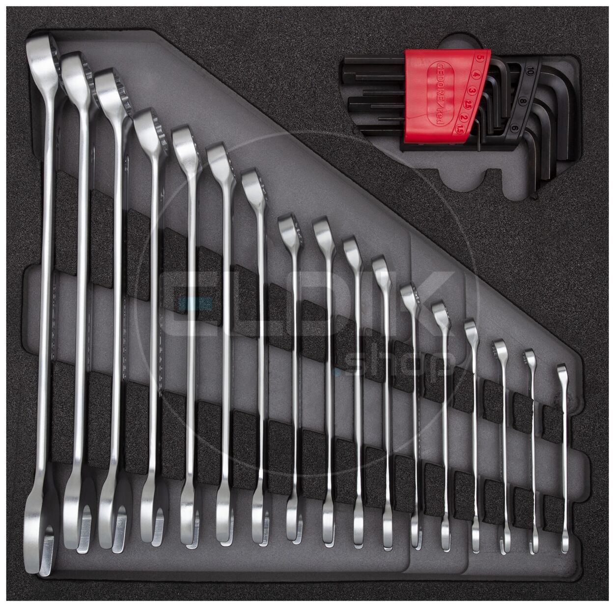 De GEDORE R22250000 is een complete 26-delige sleutelset in schuimstofmodule, ideaal voor professioneel gebruik in werkplaats en industrie. De set combineert Ring - Steeksleutel en een Inbussleutel (inbus/imbus), overzichtelijk en veilig opgeborgen in een schuimstofmodule die perfect past in GEDORE werkbanken en gereedschapswagens. De combinatiesleutels zijn uitgevoerd volgens DIN 3113, vorm A / ISO 3318, ISO 7738 en voorzien van een ringzijde met 15° hoek voor optimale bereikbaarheid. De zeskant-inbussleutels zijn volgens DIN ISO 2936 gemaakt van volledig gehard, gefosfateerd chroom-vanadiumstaal.