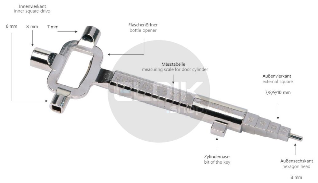 - Veelzijdige toepassingsmogelijkheden: deuropener, schakelkastsleutel en flesopener