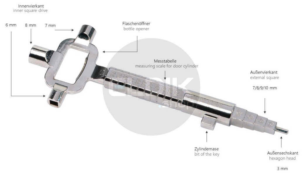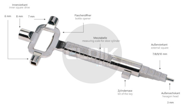 • Veelzijdige toepassingsmogelijkheden: deur­opener, schakelkastsleutel en flesopener