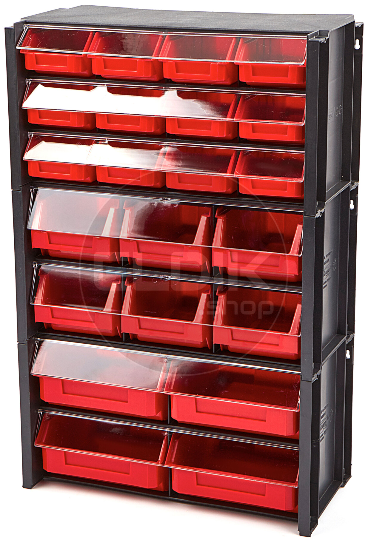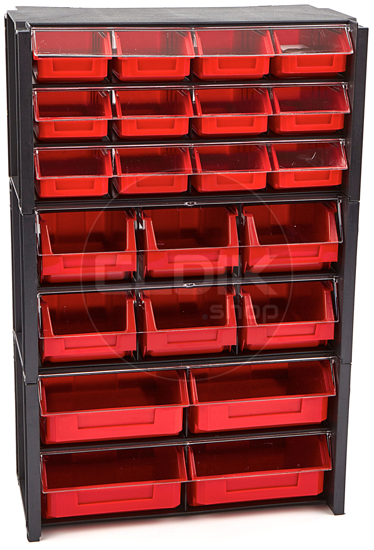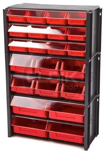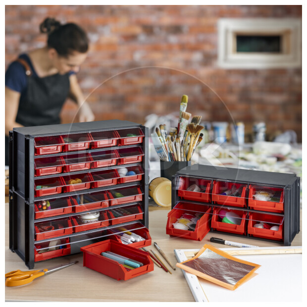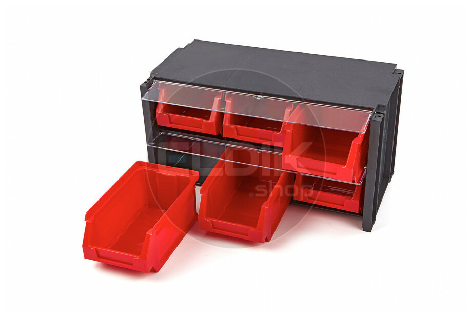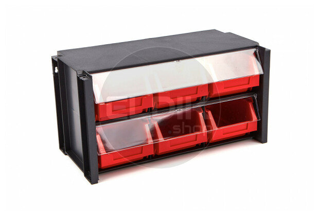• Gemaakt van stevig zwart kunststof, met rode magazijnbakken en transparante deksels