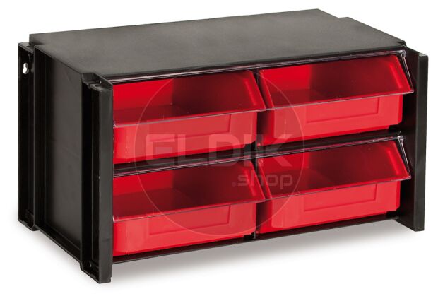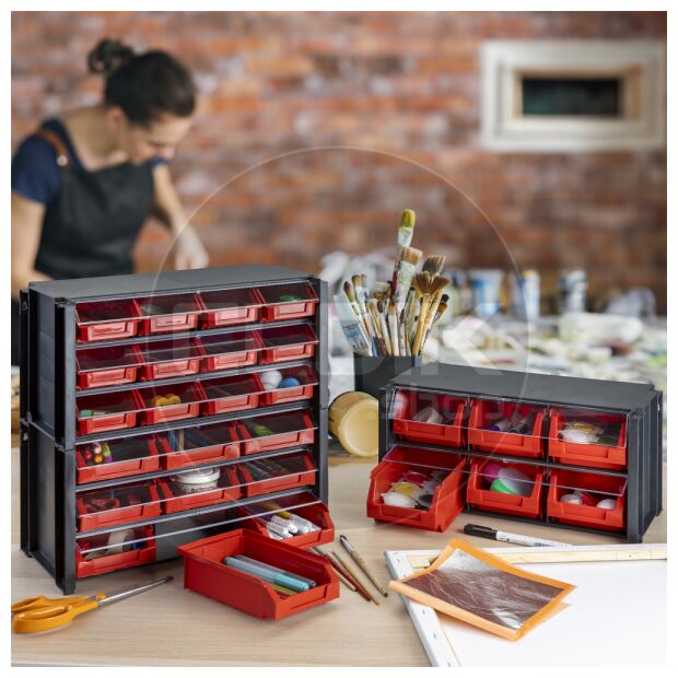 - Gemaakt van stevig zwart kunststof met rode bakken