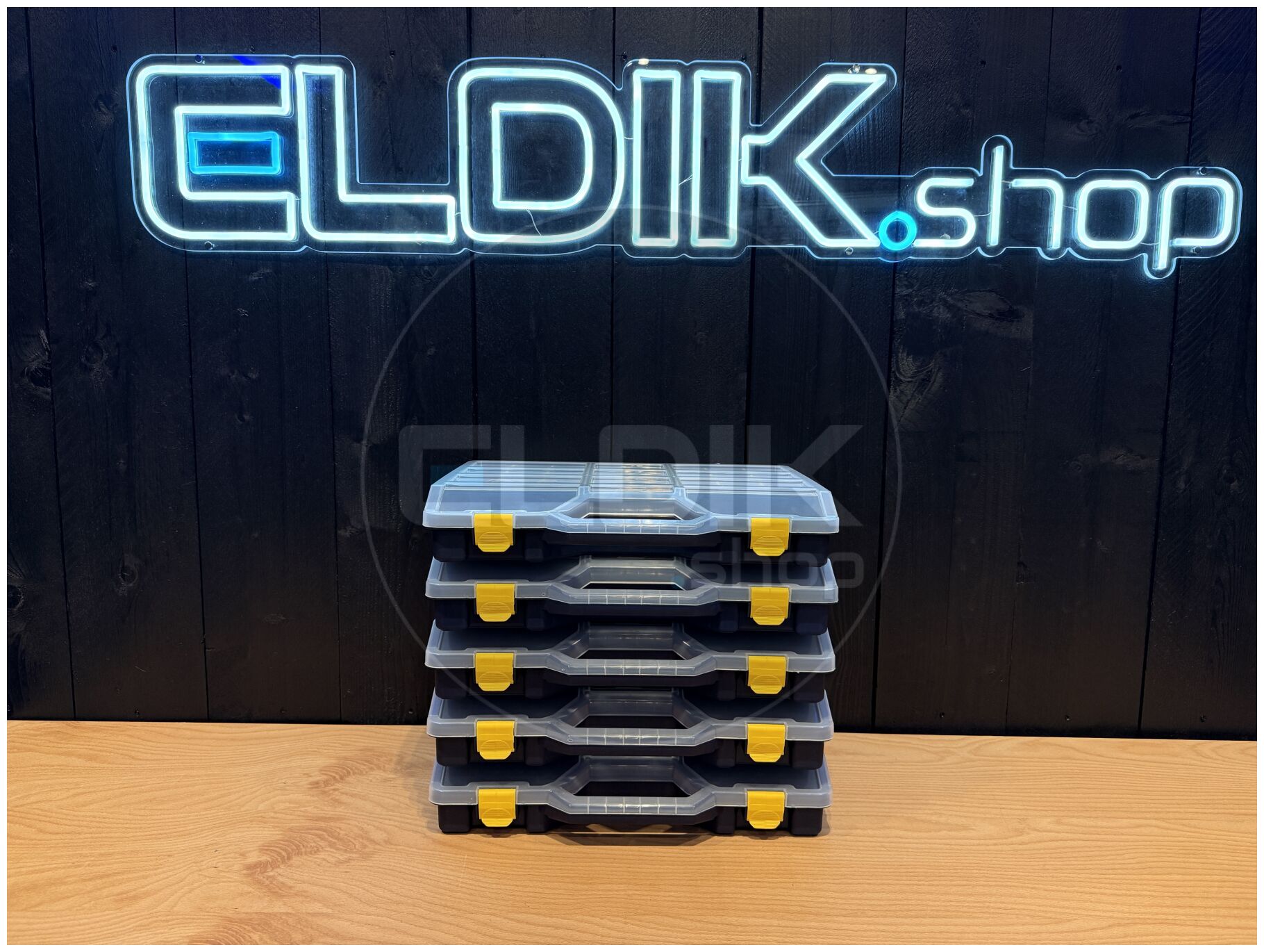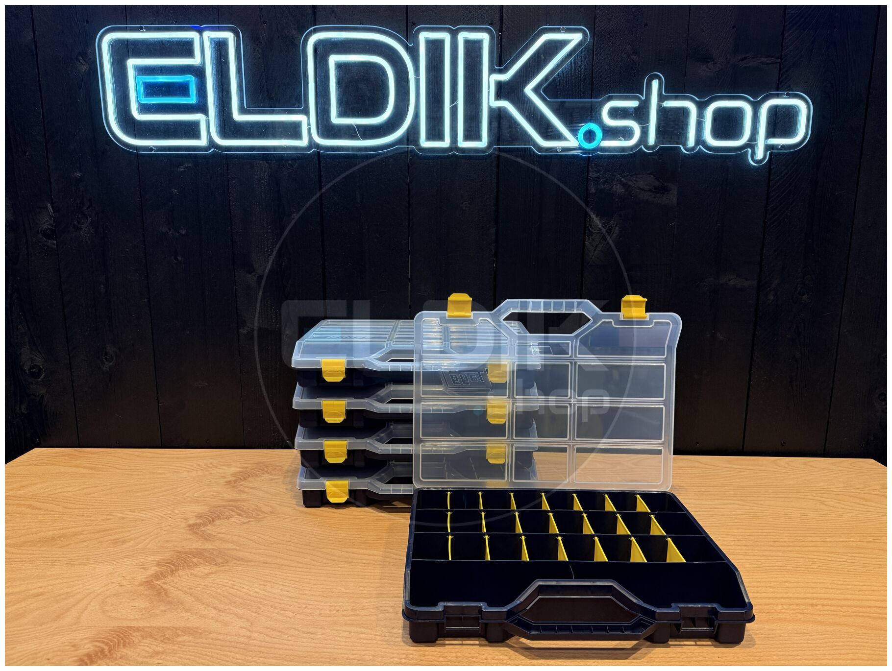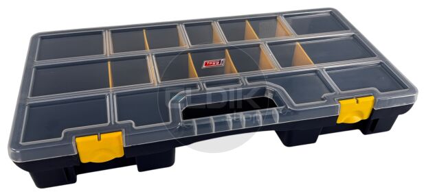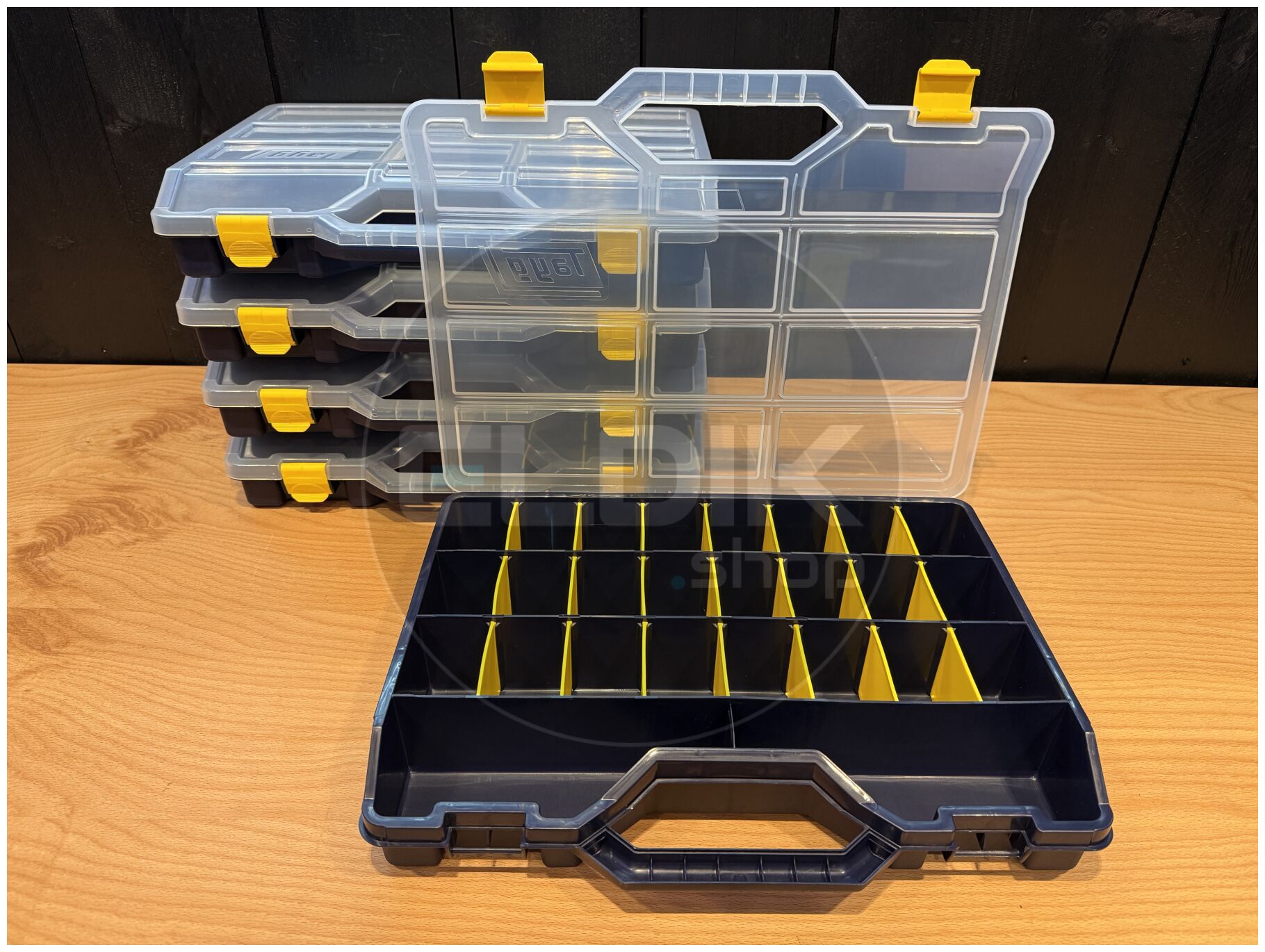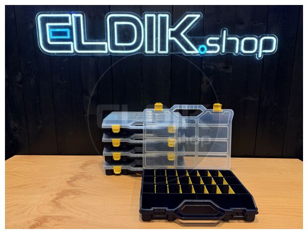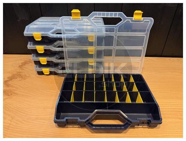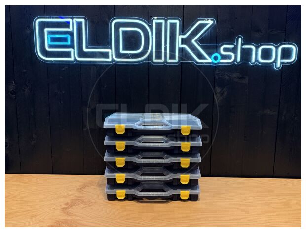 Tayg 47-26 – Set van 5 Assortimentsdozen L460 × B350 × H81 mm De Tayg 47-26 set van 5 stuks biedt een complete en voordelige oplossing voor het organiseren van grotere hoeveelheden kleine onderdelen en accessoires. Met de royale afmetingen van 460 × 350 × 81 mm per doos en de verstelbare verdeelschotten richt je iedere doos naar eigen wens in. Dankzij het transparante deksel, het stapelbare ontwerp en het stevige polypropyleen is dit een duurzame en professionele keuze voor werkplaats, magazijn of hobbyruimte.Kenmerken